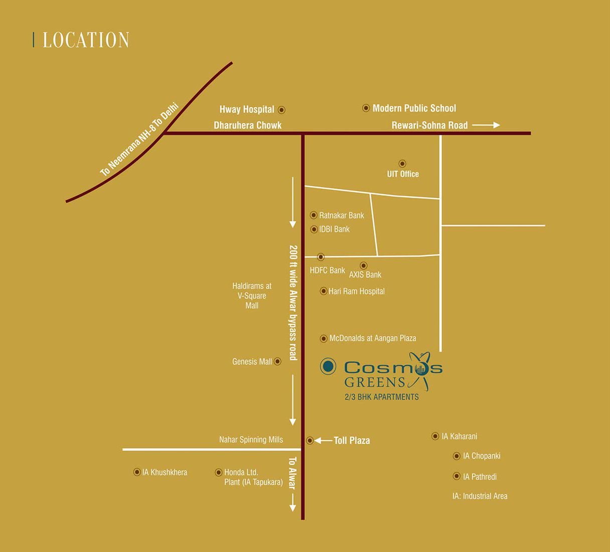 What makes Cosmos Greens, Bhiwadi a project more than just fancy buildings and tall towers is the fact that Cosmos Greens is a project with close proximity to Indira Gandhi International Airport (IGIA) while managing to ensure best location wise availability for daily routine work like markets, banks etc. Find everything right at your doorstep